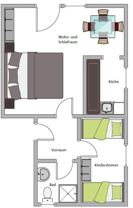 Cozy apartment with a living-sleeping room, one bedroom, fully equipped kitchen, bathroom with toilet, and a large southwest-facing balcony. Ideal for a comfortable stay for your family.